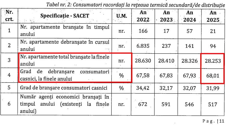 În privința totalului de consumatori casnici, din care apartamentele dețin cota covărșitoare, rata de debranșare era la sfârșitul anului de 68%, ceea ce indică faptul că doar 32% dintre consumatorii casnici mai beneficiază de căldură prin sistemul centralizat.