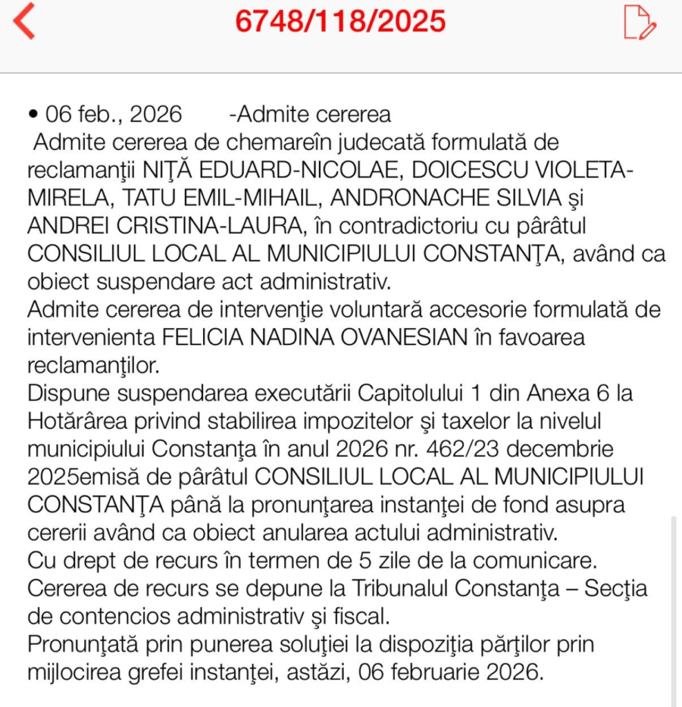 Avocații Mirela Doicescu, Silvia Andronache, Eduard Niță și Emil Mihail Tatu, au formulat o cerere de suspendare a Capitolului 1 din Anexa 6 la Hotărârii de Consiliu Local Constanța cu privire la introducerea și în 2026 a taxei de utilizare a domeniului public, în cuantum de 200 lei pe an.