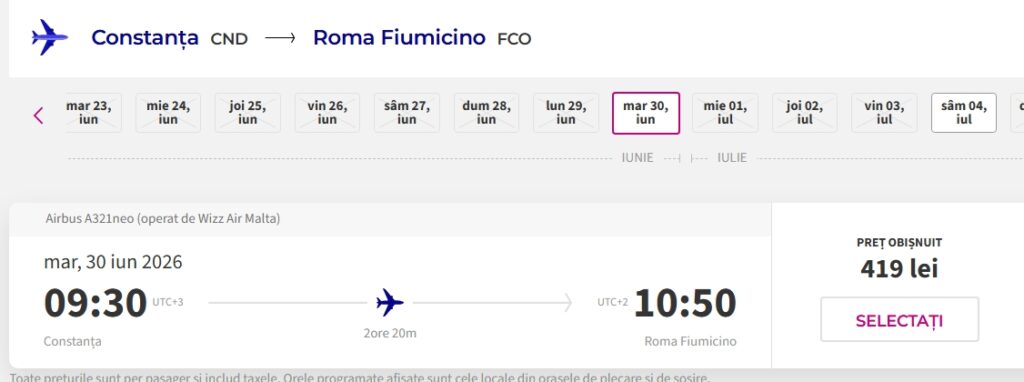 Compania care exectuează aceste curse este Wizz Air și, conform site-ului oficial, prețul unui bilet Constanța-Roma este de 419 lei (prețurile se modifică în conformitate cu politica fiecărei companii aeriene). Desigur, prețul include strict un rucsac, fără altfel de bagaje sau rezervarea din timp a locului.